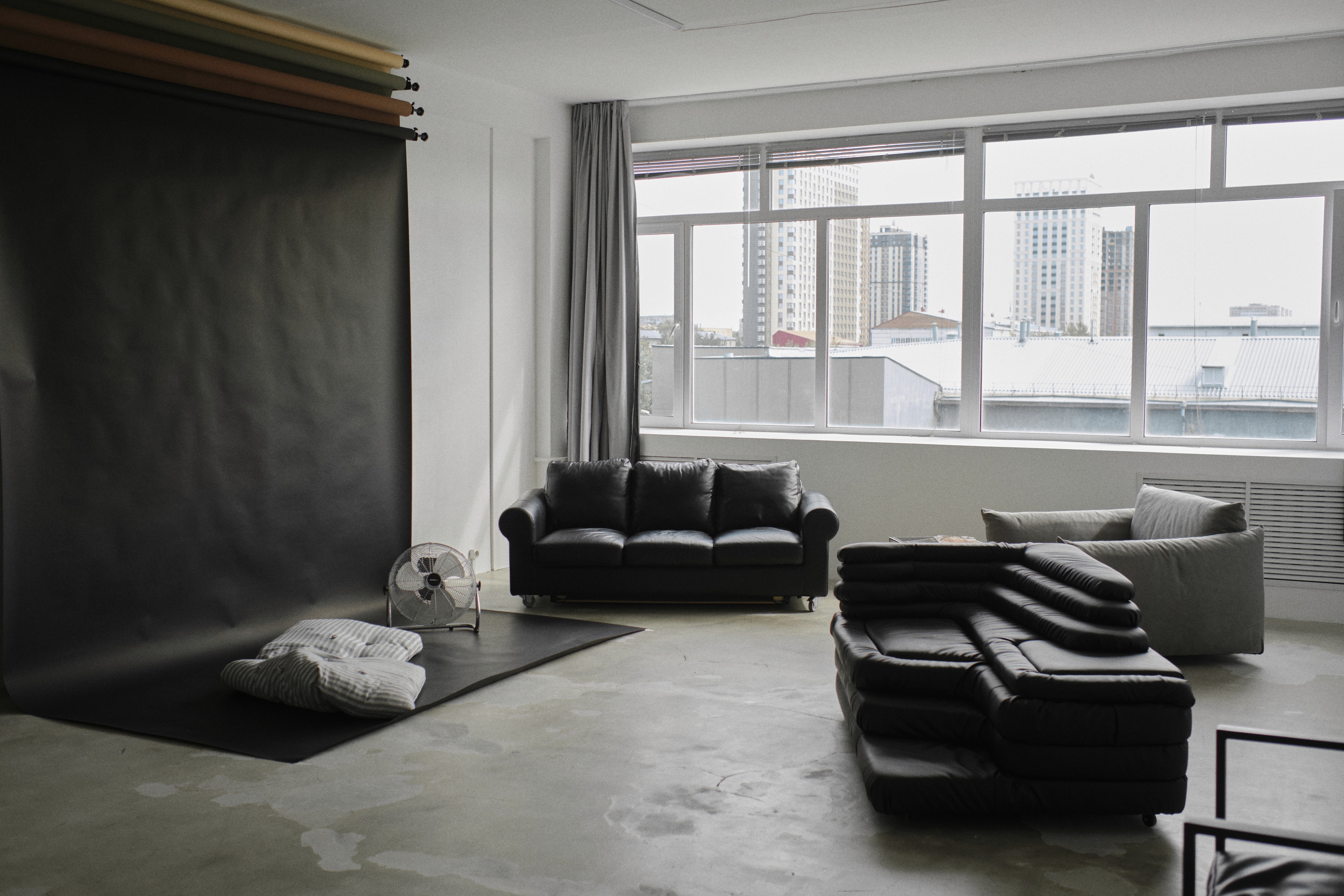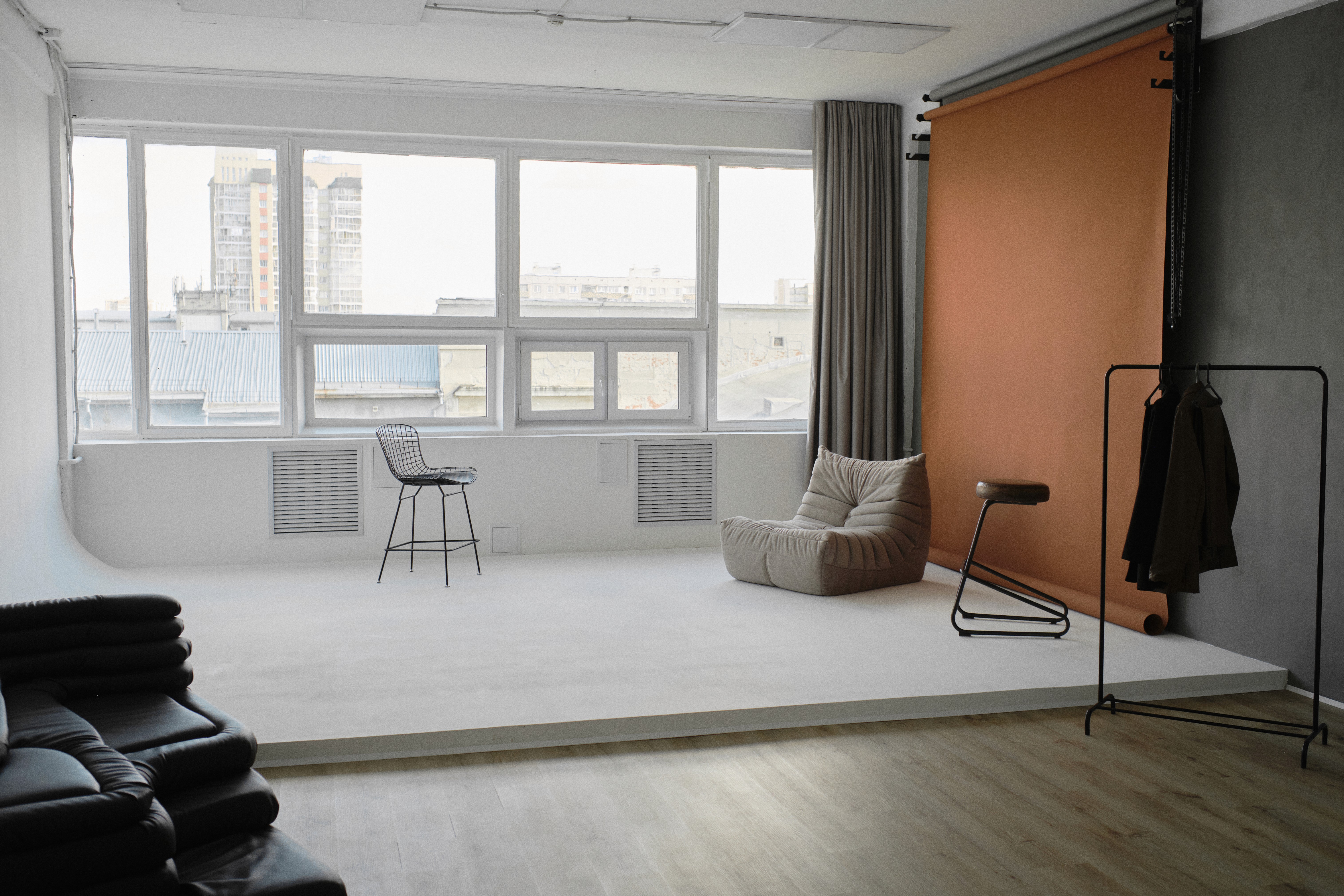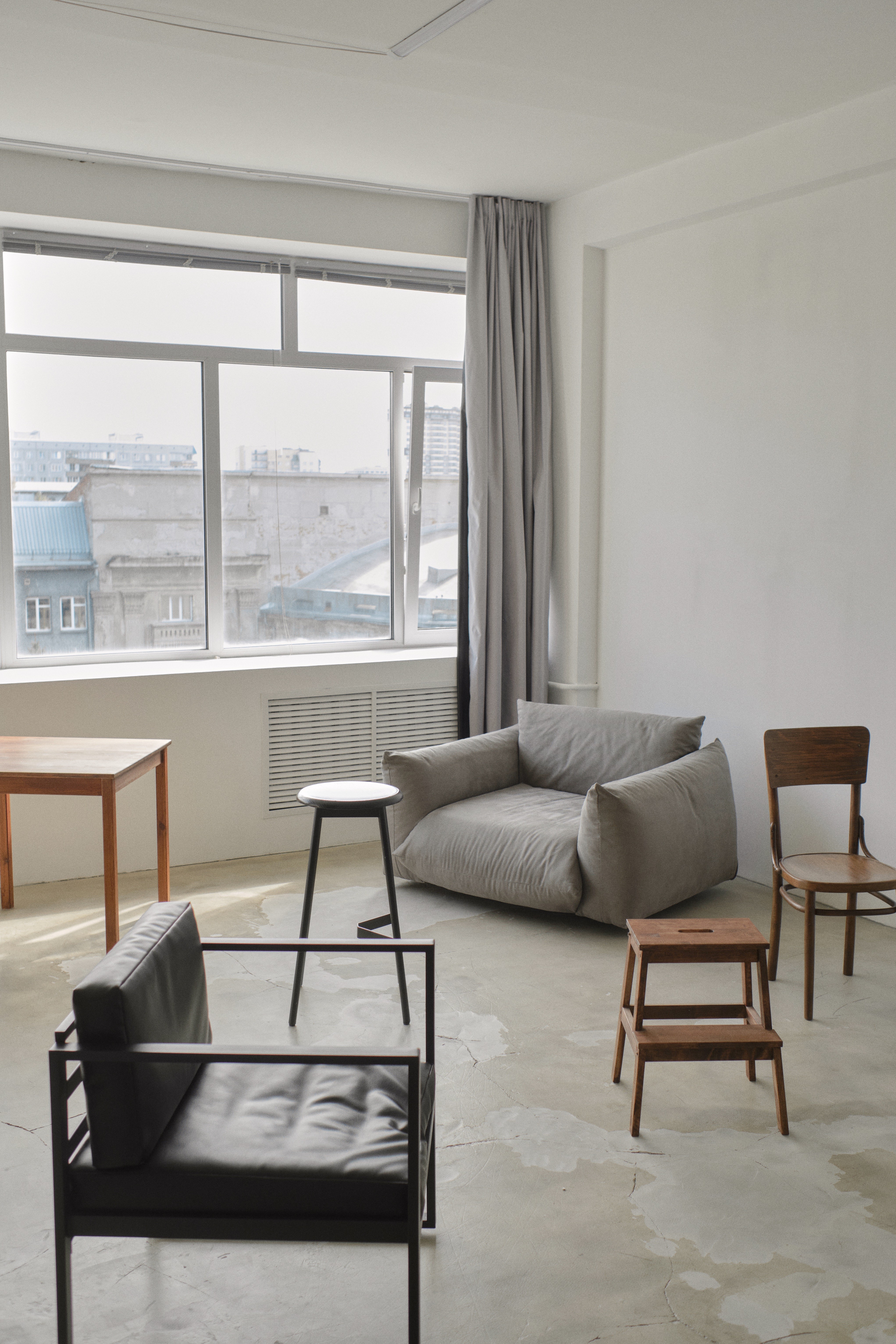 классический кожаный диван, модульный диван-лофт, серое кресло-пуф, деревянный стол, стулья, журнальный столик
