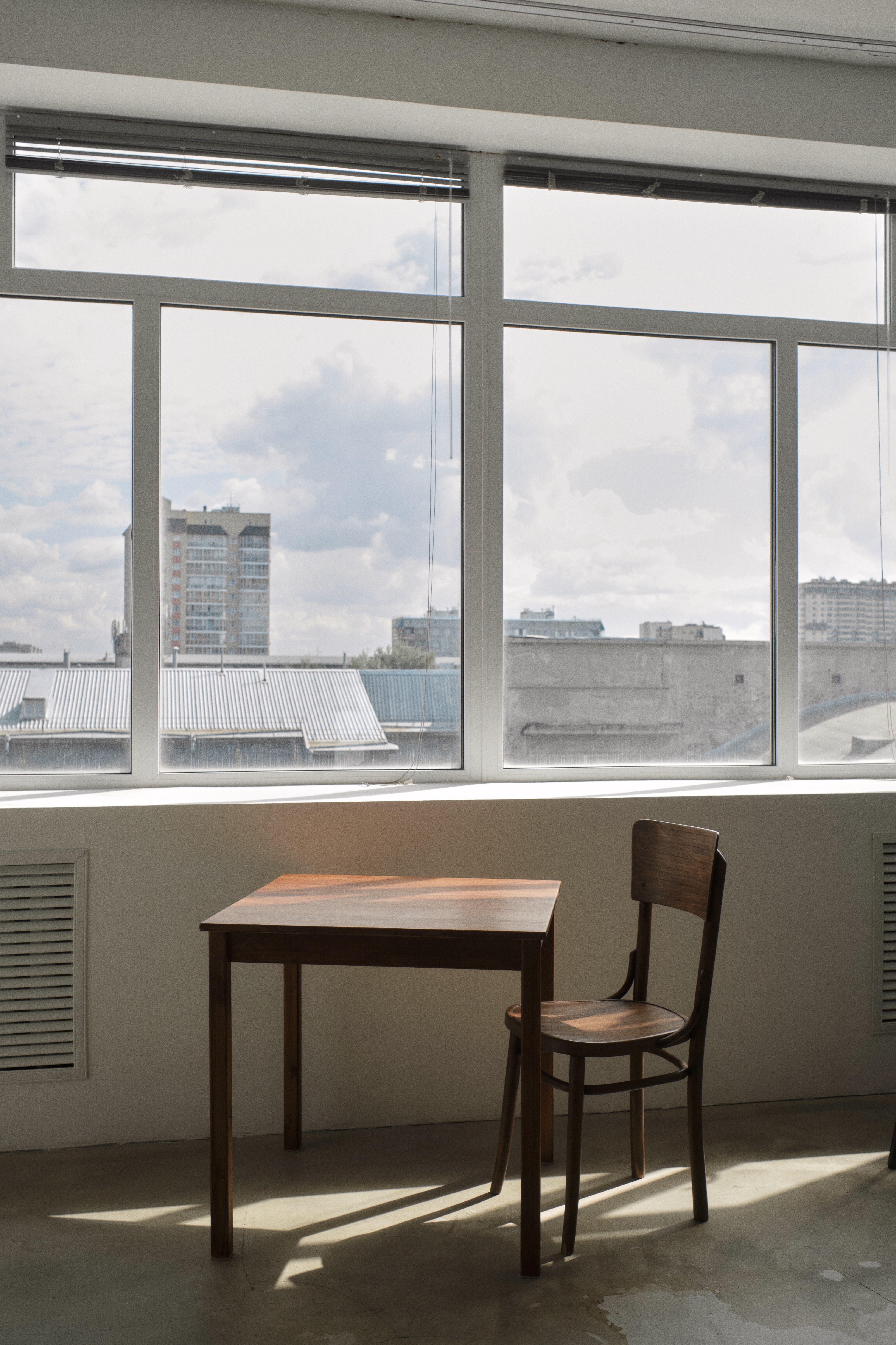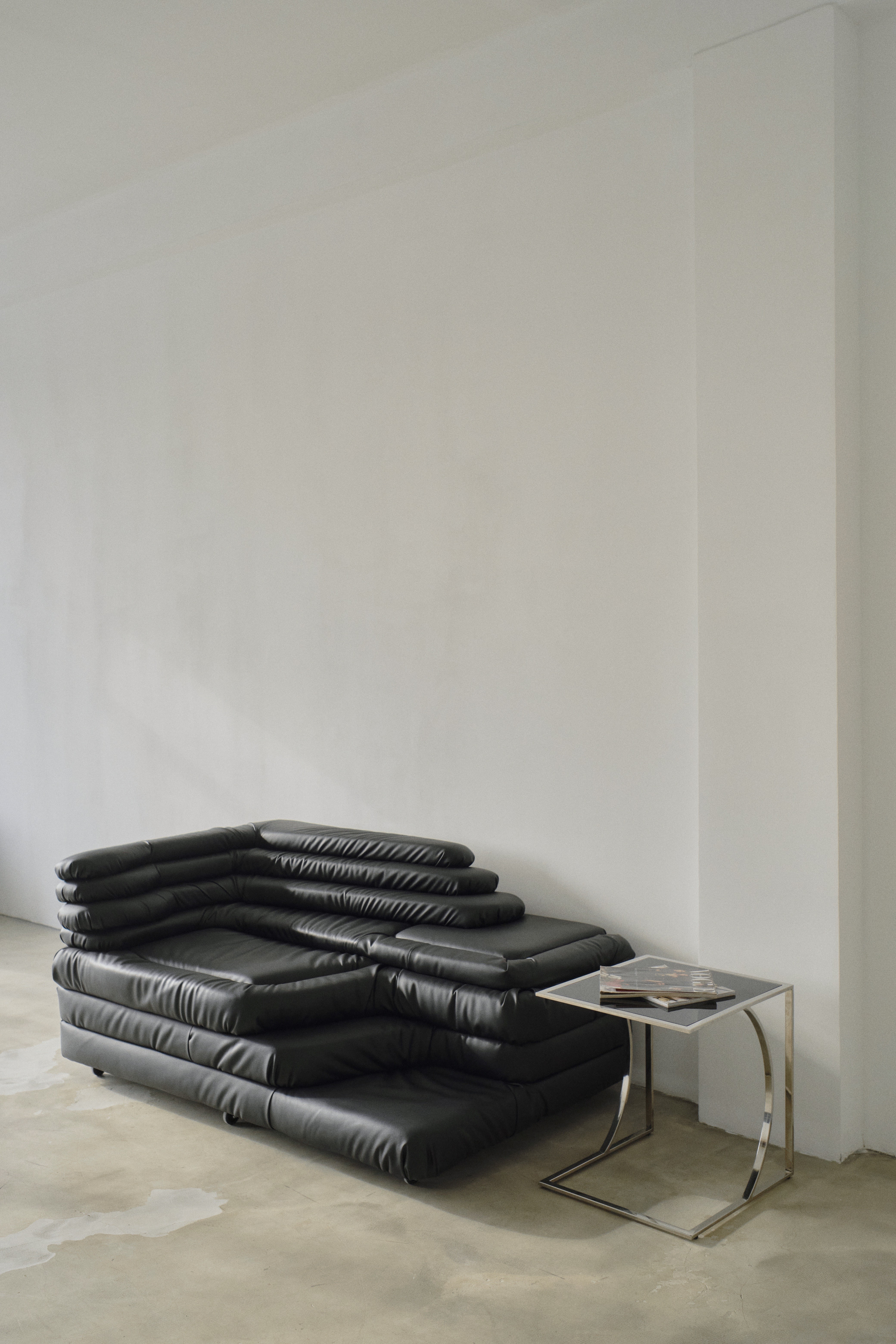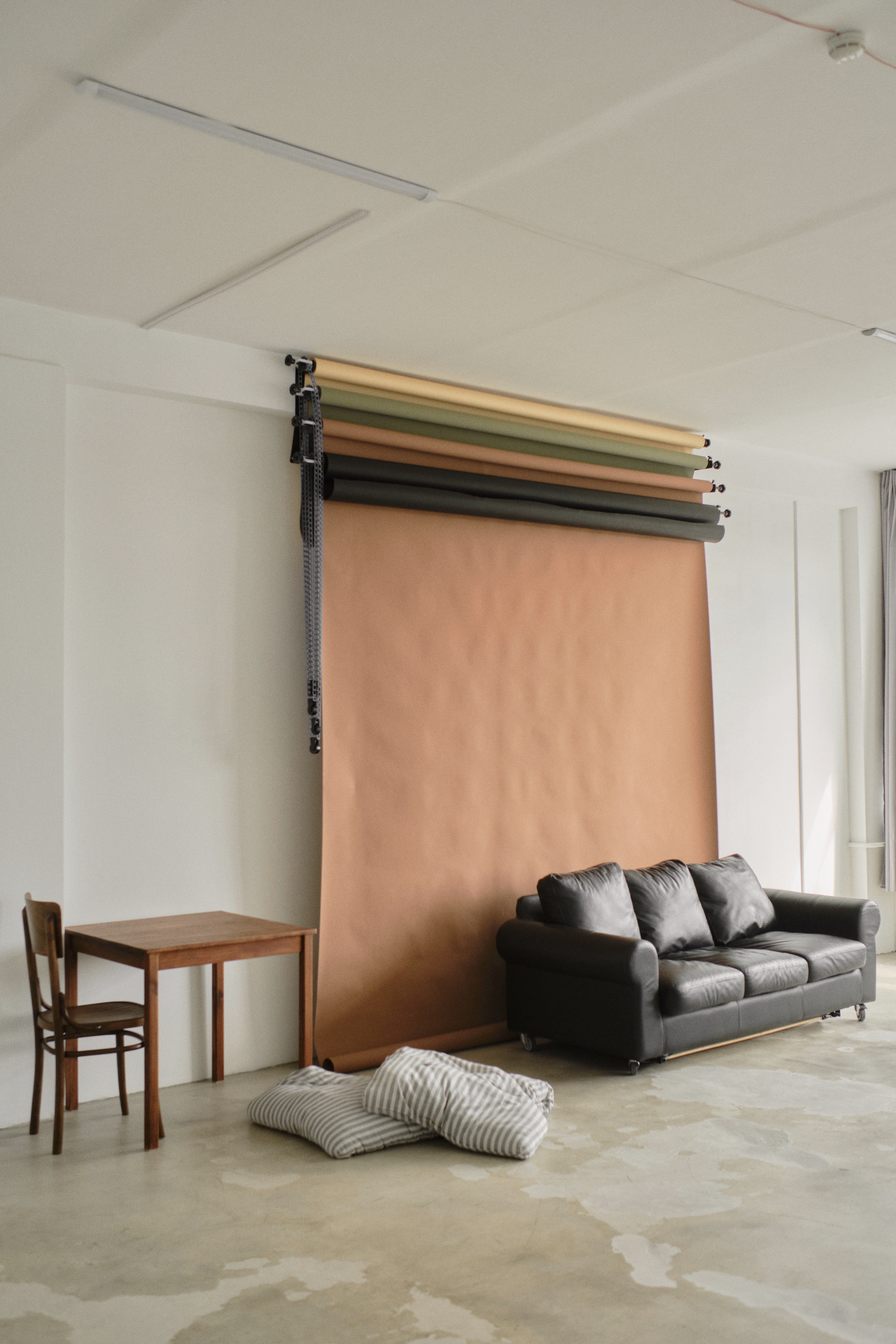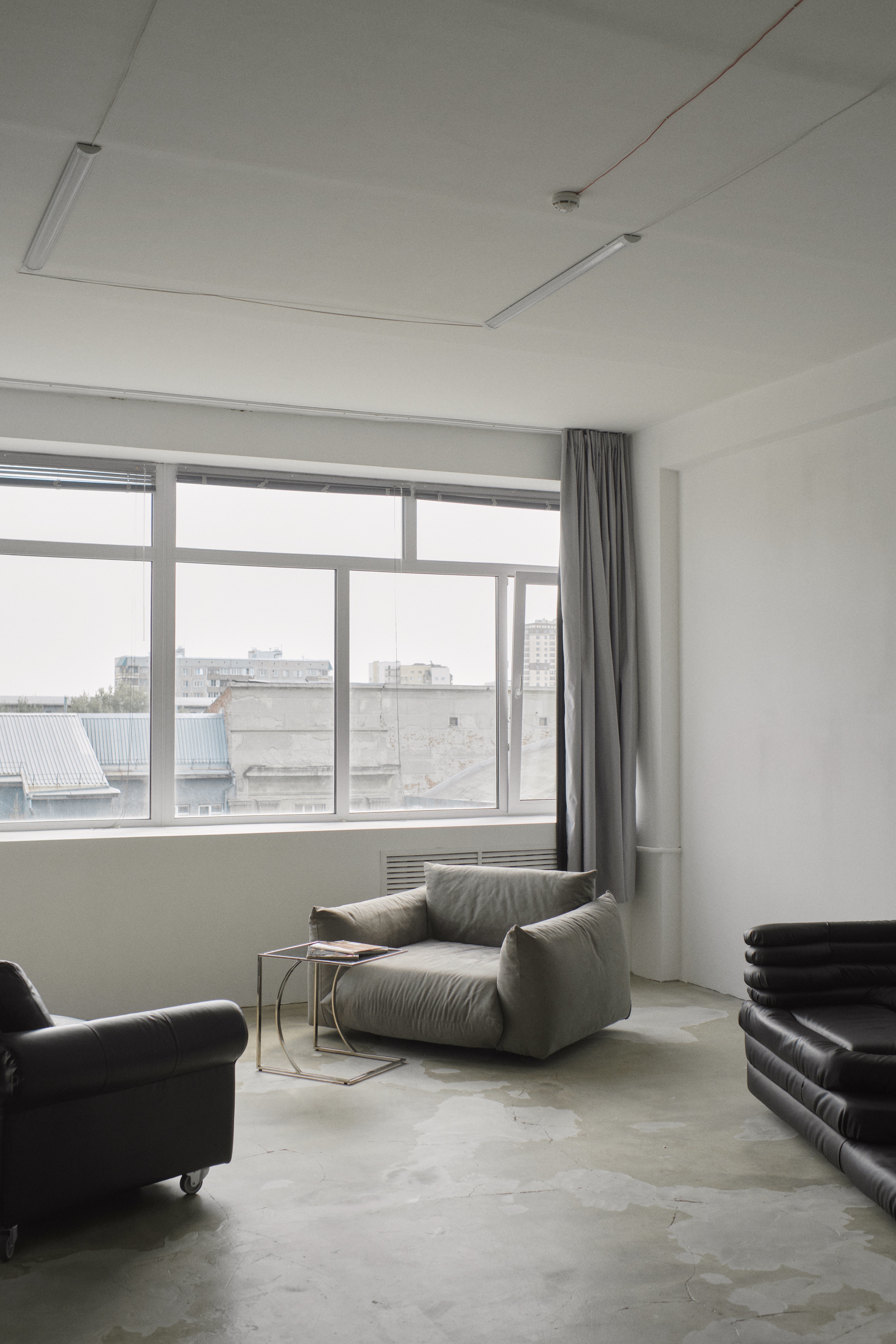 классический кожаный диван, модульный диван-лофт, серое кресло-пуф, деревянный стол, стулья, журнальный столик